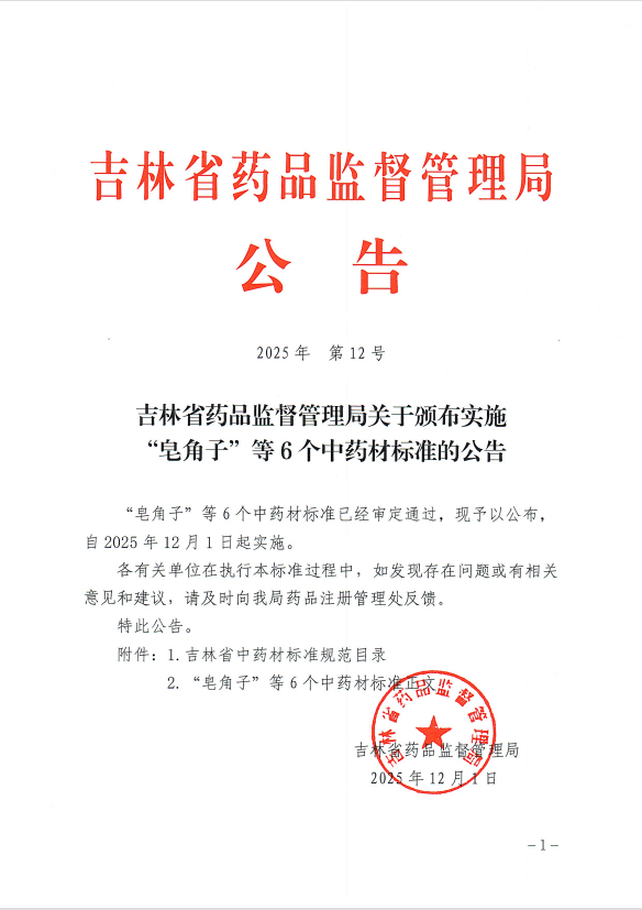 AG百家乐关于颁布实施“皂角子”等6个中药材标准的公告 2025年第12号