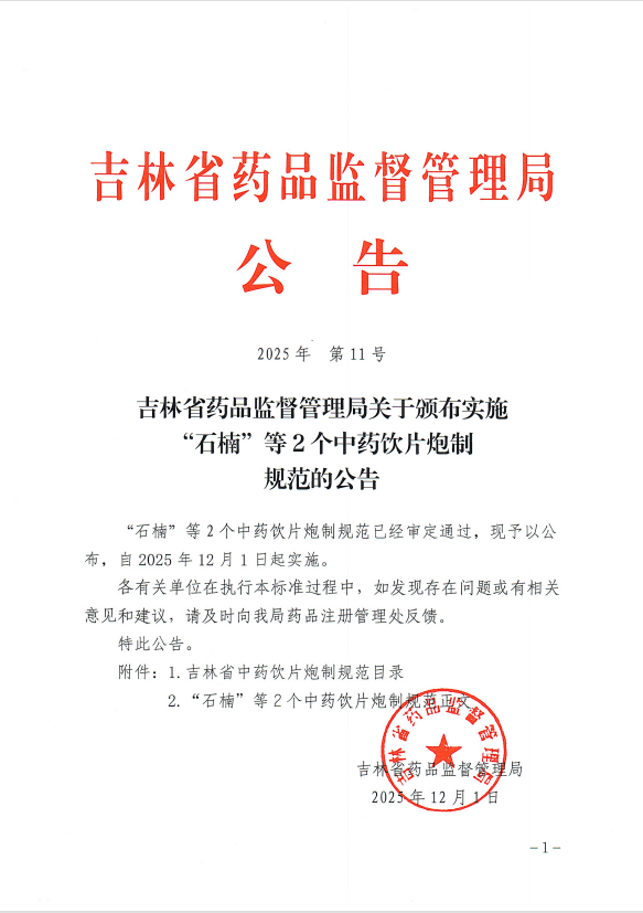 AG百家乐关于颁布实施“石楠”等2个中药饮片炮制规范的公告 2025年第11号